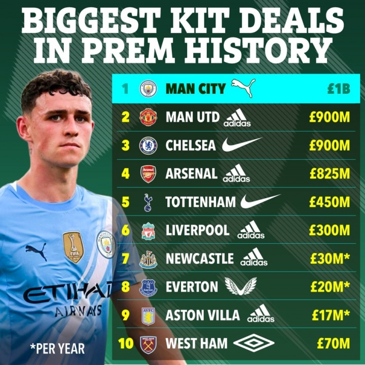 曼徹斯特城的合同還超過了曼聯(lián)和阿迪達斯簽署的9億英鎊合同,以及皇家馬德里和阿迪達斯之間8年的9.5億英鎊合同,成為足球歷史上最大的澤西島贊助合同。