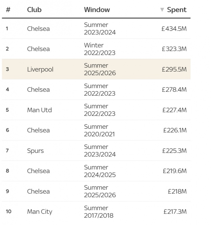 根據(jù)Sky Sports統(tǒng)計,利物浦在英超聯(lián)賽的歷史支出列表中排名第三,小于切爾西的2022-23冬季窗口和2023-24夏季窗口。
